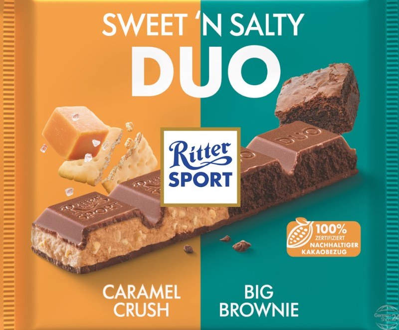 Ritter Sport Sweet ‘n Salty Duo is a decadent blend of creamy milk chocolate, gooey caramel, and fudgy brownie—with just a touch of salt for the perfect finish. Each square combines two irresistible fillings: Caramel Crush, with its buttery sweetness and light crunch, and Big Brownie, a soft, chewy layer full of rich cocoa flavor.